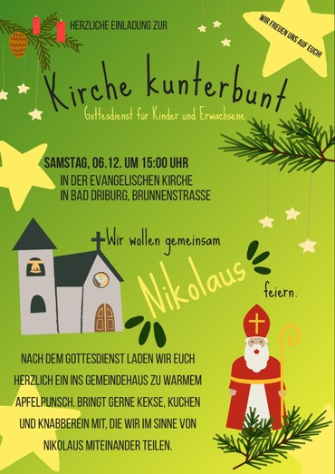 Familiengottesdienst Kirche kunterbunt – anschließend gemütliches Beisammensein mit Apfelpunsch. Wer mag, darf gerne Kekse oder anderes Gebäck mitbringen.
