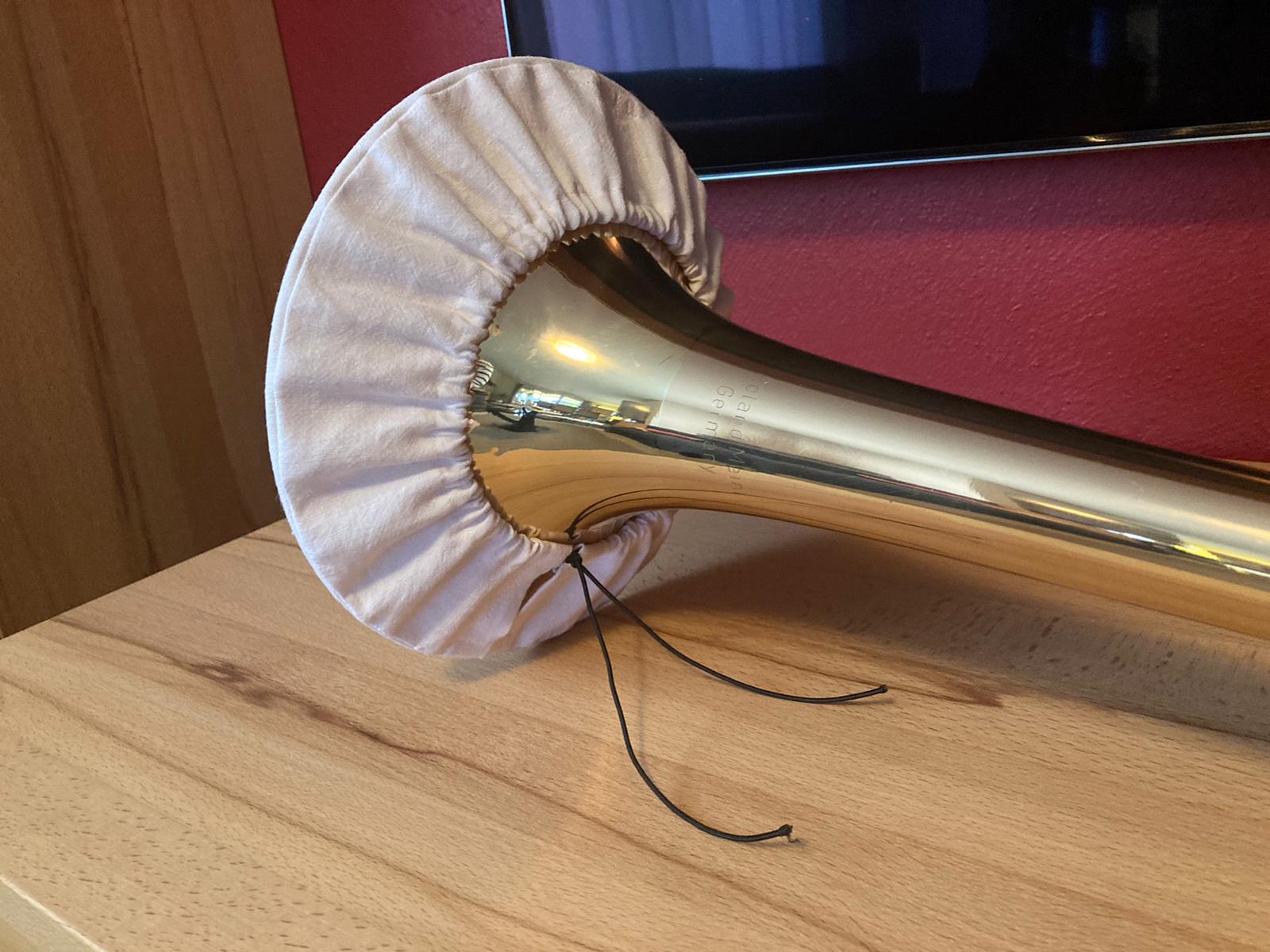 Jedes Instrument brauchte einen Schutz über den Schalltrichter, damit die Aerosole nicht ungehindert „herausposaunt“ werden können. Ganz unterschiedlich wurde diese Aufgabe gelöst: Mal nach eigenem Schnittmuster selbst genäht, mal beim Schneider eine Maßanfertigung in Auftrag gegeben, mal den Schalltrichter mit einem Tuch umwickelt.
