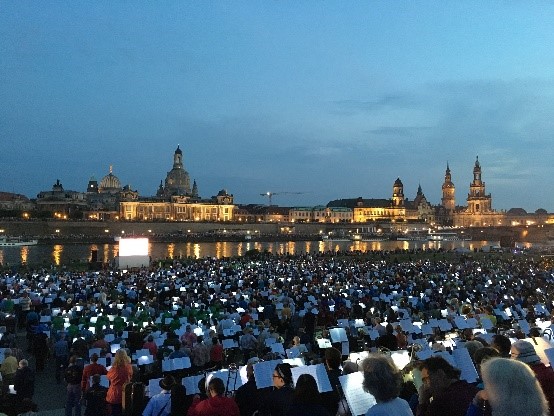 Am Nachmittag herrschte buntes Treiben in der gesamten Innenstadt: Die verschiedenen Posaunenchor-Verbände boten Info-Stände und Mitmach-Aktionen, an fast jeder Ecke erklang Musik und jeder hatte die Möglichkeit das Elbflorenz auf eigene Faust oder auch im Rahmen einer Stadtführung zu entdecken. So wurde es schnell Abend und schon eilten wir zum nächsten Termin, der Serenade am Elbufer.